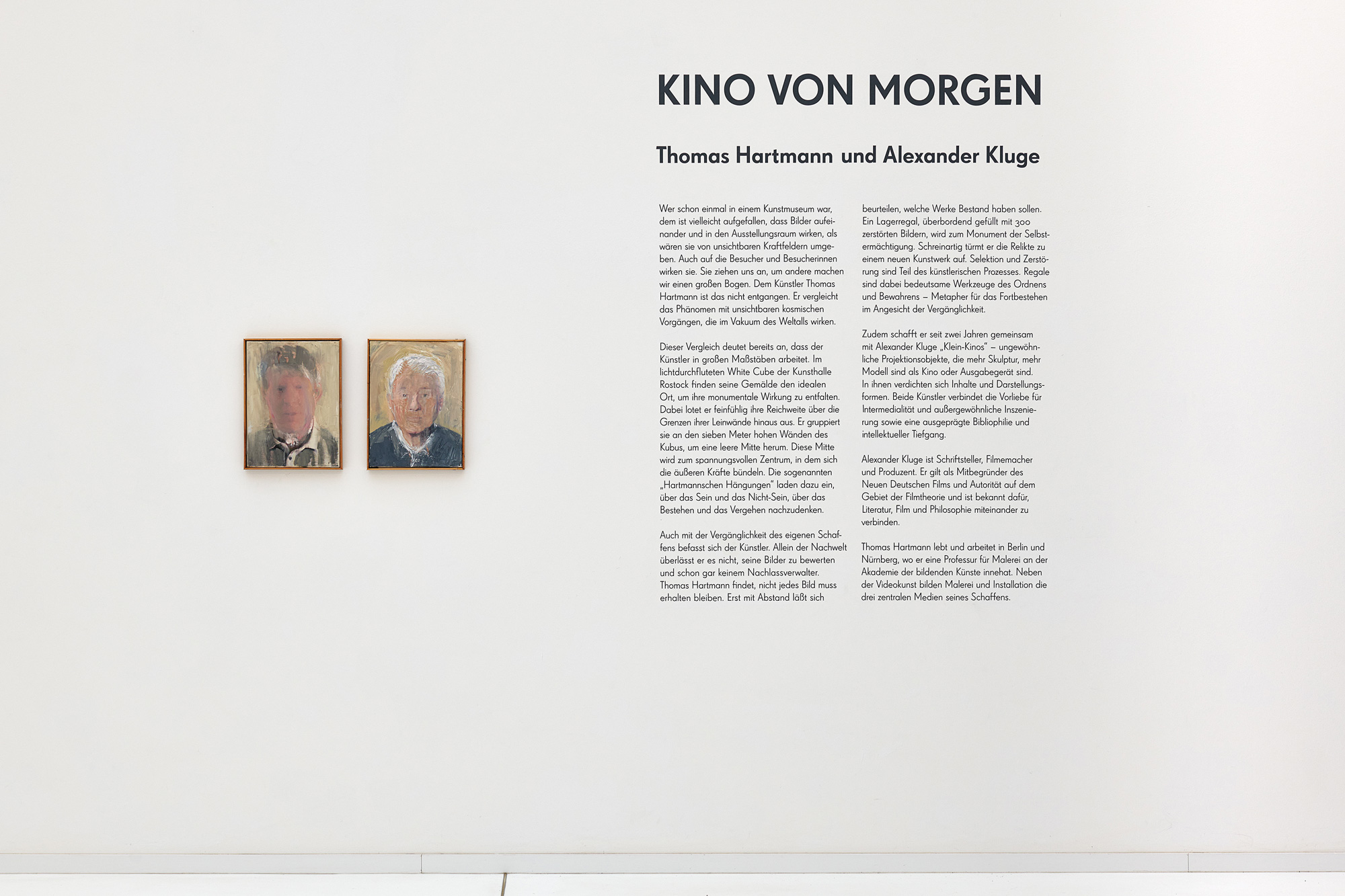 Dieser Vergleich deutet bereits an, dass der Künstler in großen Maßstäben arbeitet. Im lichtdurchfluteten White Cube der Kunsthalle Rostock finden seine Gemälde den idealen Ort, um ihre monumentale Wirkung zu entfalten. Dabei lotet er feinfühlig ihre Reichweite über die Grenzen ihrer Leinwände hinaus aus. Er gruppiert sie an den sieben Meter hohen Wänden des Kubus, um eine leere Mitte herum. Diese Mitte wird zum spannungsvollen Zentrum, in dem sich die äußeren Kräfte bündeln. Die sogenannten „Hartmannschen Hängungen“ laden dazu ein, über das Sein und das Nicht-Sein, über das Bestehen und das Vergehen nachzudenken.