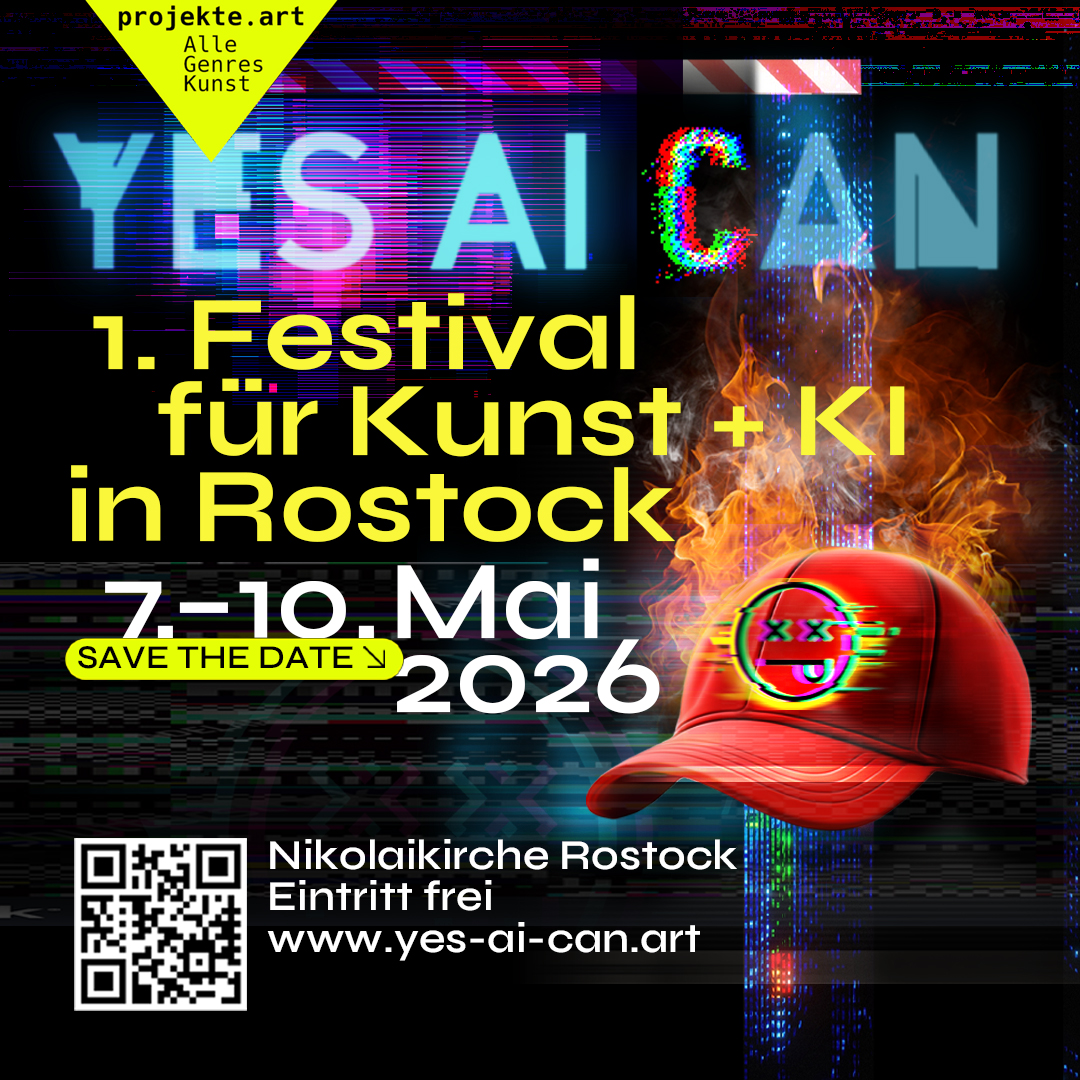 Im Rahmen des Festivals zeigt die Kunsthalle Rostock mit Unterstützung der Stadtwerke Rostock AG ein Projekt, das durch die KI entstanden ist. Es werden Werke sowie der Projektverlauf gezeigt, die durch die KI konzipiert und erstellt wurden. Besucherinnen haben die Möglichkeit, in Interaktion mit dem Projekt zu treten. Das Festival YES AI CAN findet vom 07.05.-10.05.2026 in Rostock statt und wird von der Kunsthalle Rostock und dem Volkstheater Rostock unterstützt. Weitere Informationen zum Programm des Festivals finden Sie hier. Talk am 6. Mai zum Thema "Wie verändert sich die Arbeitswelt mit KI?" Chancen, Herausforderungen und gesellschaftliche Folgen künstlicher Intelligenz* im Obergeschoss des Schaudepots mit: Thomas Böhm, Geschäftsführer Juni Media GmbH & Co. KG Beate Kasch, Managerin InnoCampus Stadtwerke Rostock AG Gabriel Rath, New Work Chat. Der Podcast für die neue Arbeitswelt Jonas-Otto Schneider, Geschäftsführer von aenea Marketing und Präsident der Wirtschaftsjunioren Rostock Christoph Martin Schmidt, Festivalleiter YES AI CAN FESTIVAL, projekte.art e.V. moderiert von Dr. Jörg-Uwe Neumann, Direktor der Kunsthalle Rostock