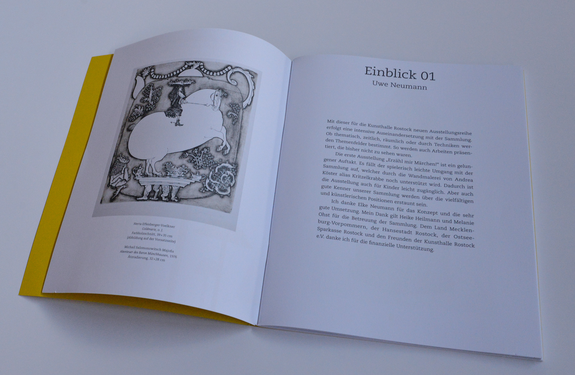 Es war einmal… So beginnen viele Märchen, die bis heute in allen Kulturen als Wissensschatz bewahrt werden. In früheren Zeiten mündlich weitergegeben, begegnen uns die Geschichten heute meist bebildert in Büchern, Filmen und im Theater. Werke aus der Sammlung der Kunsthalle Rostock zeigen die Breite der künstlerischen Auseinandersetzung mit dem Thema Märchen. Mit der Ausstellung Erzähl mir Märchen! möchte die Kunsthalle Rostock den Besuchern die Möglichkeit geben, in den Werken der Sammlung zu entdecken, wie Ideen und Sprache von Künstlern in Bilder verwandelt werden. Die fast 90 Kunstwerke von mehr als 30 Künstlern zum Thema Märchen zeigen eine große Bandbreite künstlerischen Handschriften. Die Märchenthematik wurde hier und da durch Darstellungen von Tieren ergänzt, da diese in vielen Märchen als Protagonisten auftreten. Die vielgesichtige Auswahl umfasst Handzeichnungen, Grafiken, einige wenige Gemälde und Plastiken. 14 Märchen werden ins Bild gesetzt, zudem kann man Moby Dick, Baron Münchhausen und Till Eulenspiegel begegnen, deren märchenhafte Geschichten die Auswahl ergänzen. Bereichert werden die Werke in der Ausstellung durch die von der Rostocker Illustratorin Andrea Köster, alias Kritzelkrabbe, entwickelten und gemalten Wandmalereien, die aus den Räumen der Kunsthalle ein Märchenland machen.