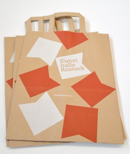 Umweltfreundliche Papiertüten mit dem Logo der Kunsthalle Rostock als Aufdruck.